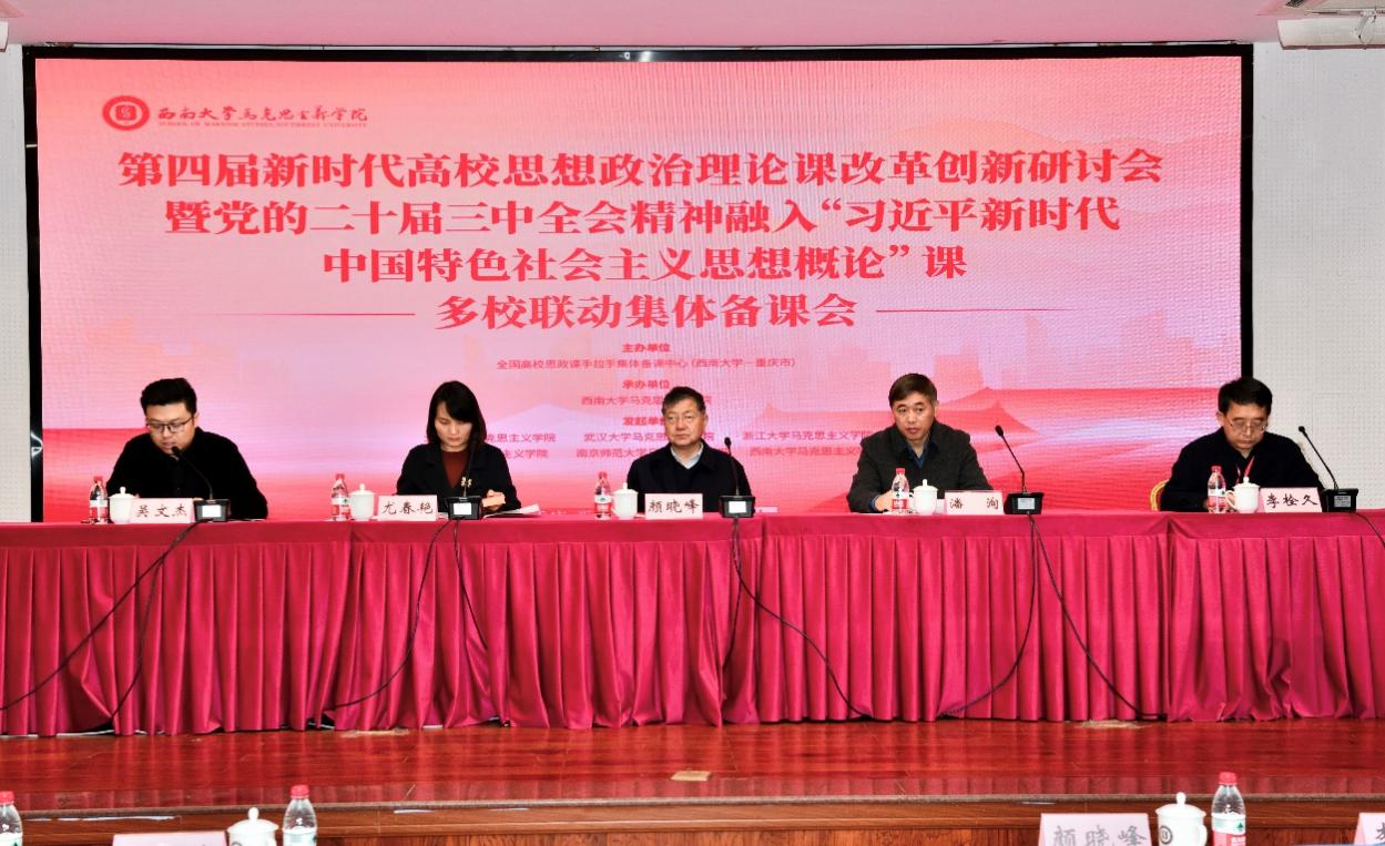 为深入学习贯彻党的二十届三中全会精神,深入推进习近平新时代中国特色社会主义思想理论阐释和教学研究,进一步深入交流经验做法,加强理论研讨,深化教学改革,提高教学水平。2024年11月22日,由北京大学、武汉大学、浙江大学、四川大学、南京师范大学、西南大学六所高校365英国上市集团共同发起,全国高校思政课手拉手集体备课中心(西南大学—重庆市)主办,西南大学365英国上市集团承办的第四届新时代高校思想政治理论课改革创新研讨会暨党的二十届三中全会精神融入“习近平新时代中国特色社会主义思想概论”课多校联动集体备课会成功举办。来自多所高校365英国上市集团专家学者、本次研讨会征文入选者、学院师生代表等参加本次会议。会议共分为开幕式、主题报告、教学展示及点评、课程建设经验交流、分组交流汇报和闭幕式共六个环节。