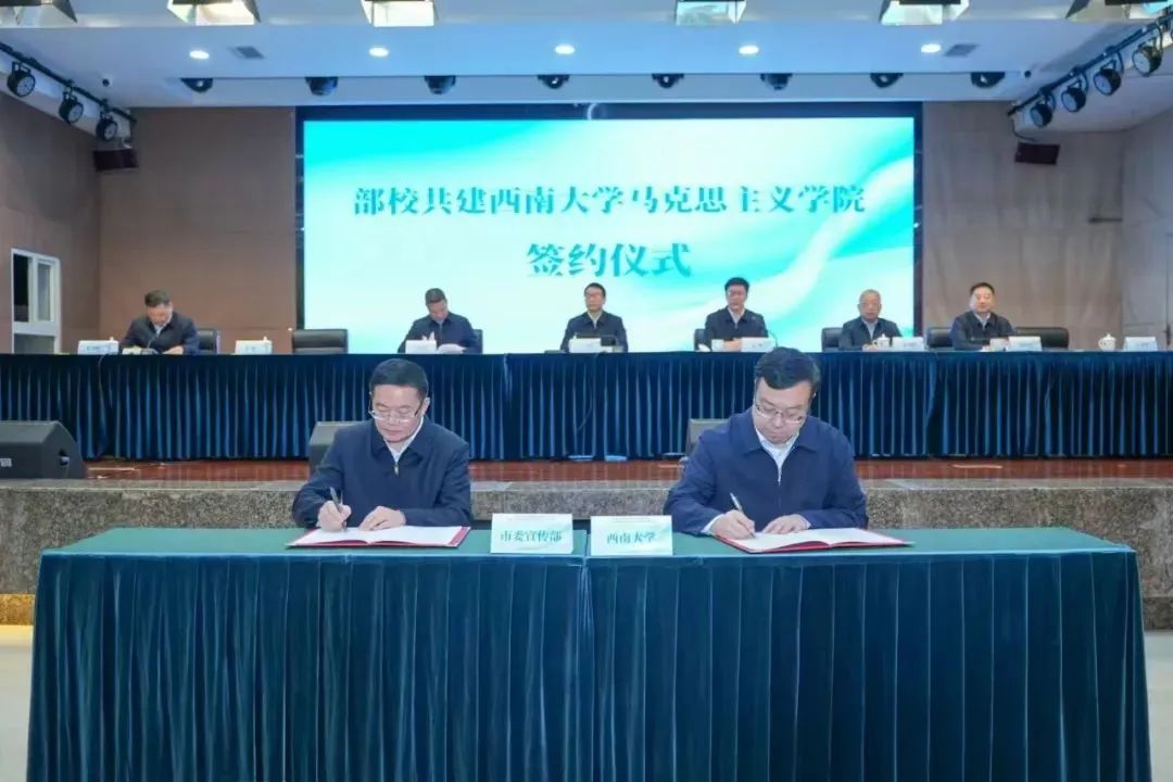 重庆市委宣传部副部长(主持日常工作)管洪与西南大学校长王进军分别代表市委宣传部、西南大学签署合作协议。