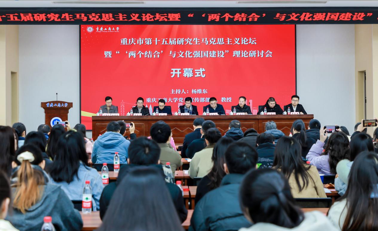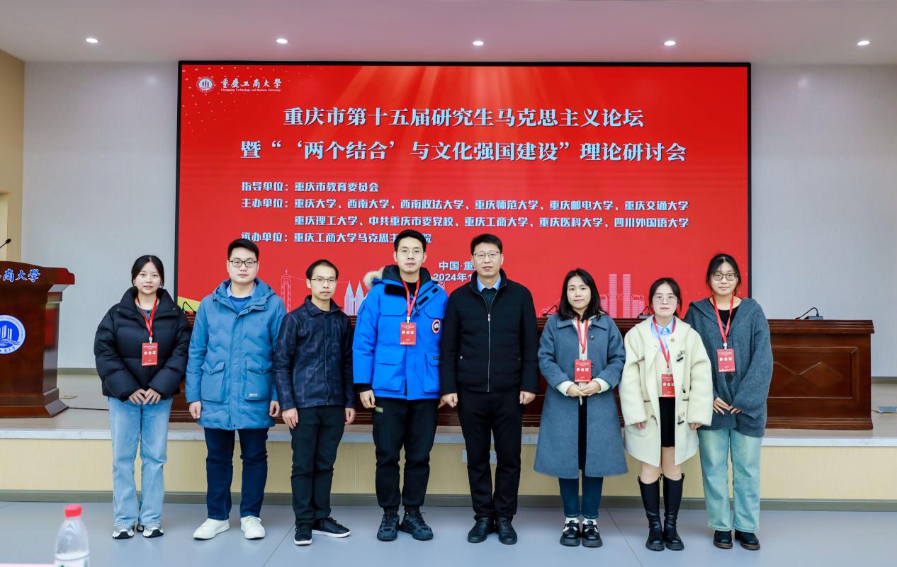 2024年12月15日,重庆市第十五届研究生马克思主义论坛暨“‘两个结合’与文化强国建设”理论研讨会在重庆工商大学南岸校区明德楼1019天健报告厅举行。本次论坛由重庆市教育委员会指导,重庆大学、西南大学、西南政法大学、重庆师范大学、重庆邮电大学、重庆交通大学、重庆理工大学、中共重庆市委党校、重庆工商大学、重庆医科大学、四川外国语大学等11所高校共同主办,重庆工商大学承办。学院党委书记吴文杰、副院长靳玉军、研究生辅导员黄林及研究生获奖代表霍广涛等6名同学应邀参会。