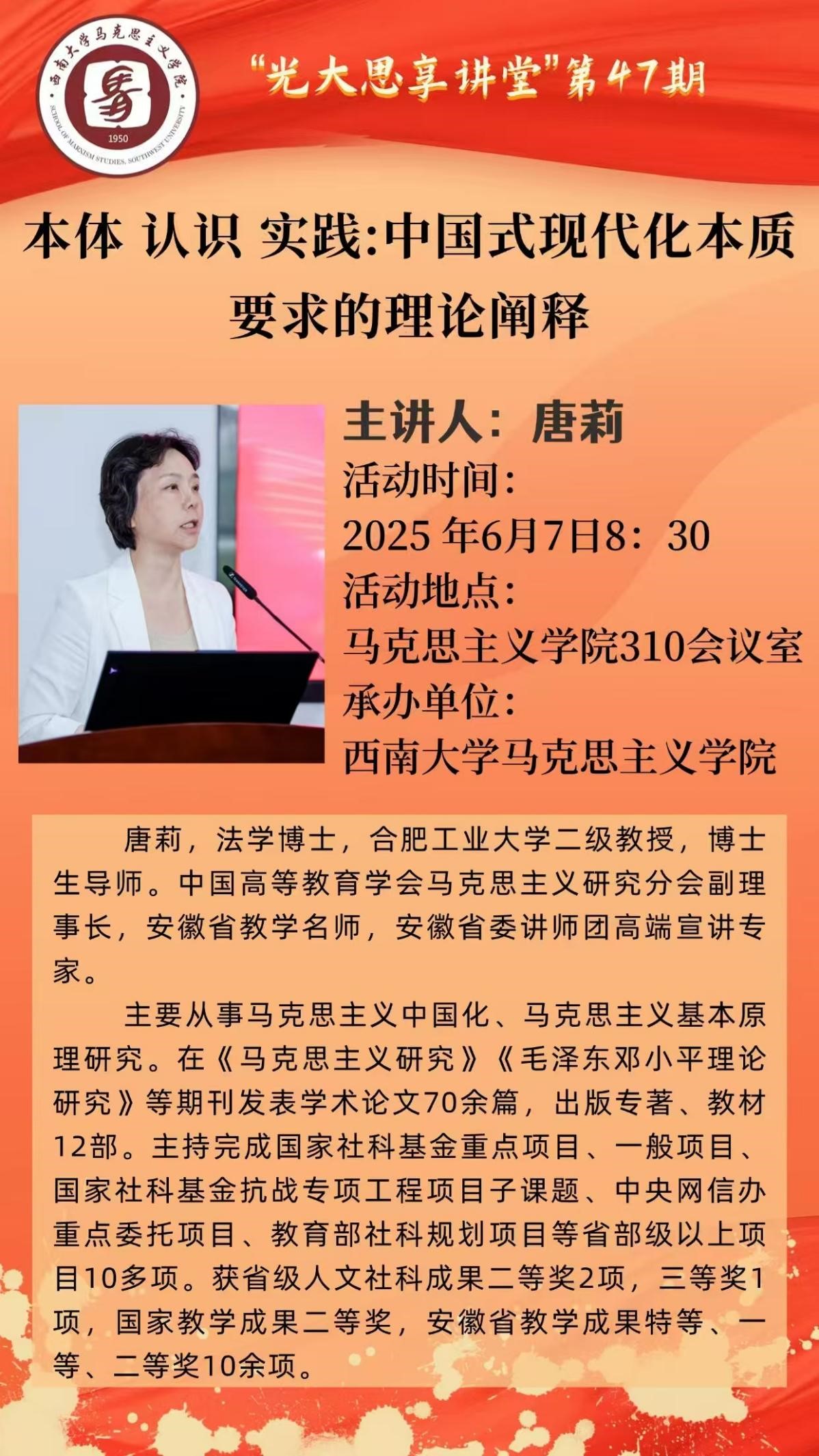 唐莉,法学博士,合肥工业大学2级教授,博士生导师。中国高等教育学会马克思主义研究分会副理事长,安徽省教学名师,安徽省委讲师团高端宣讲专家。