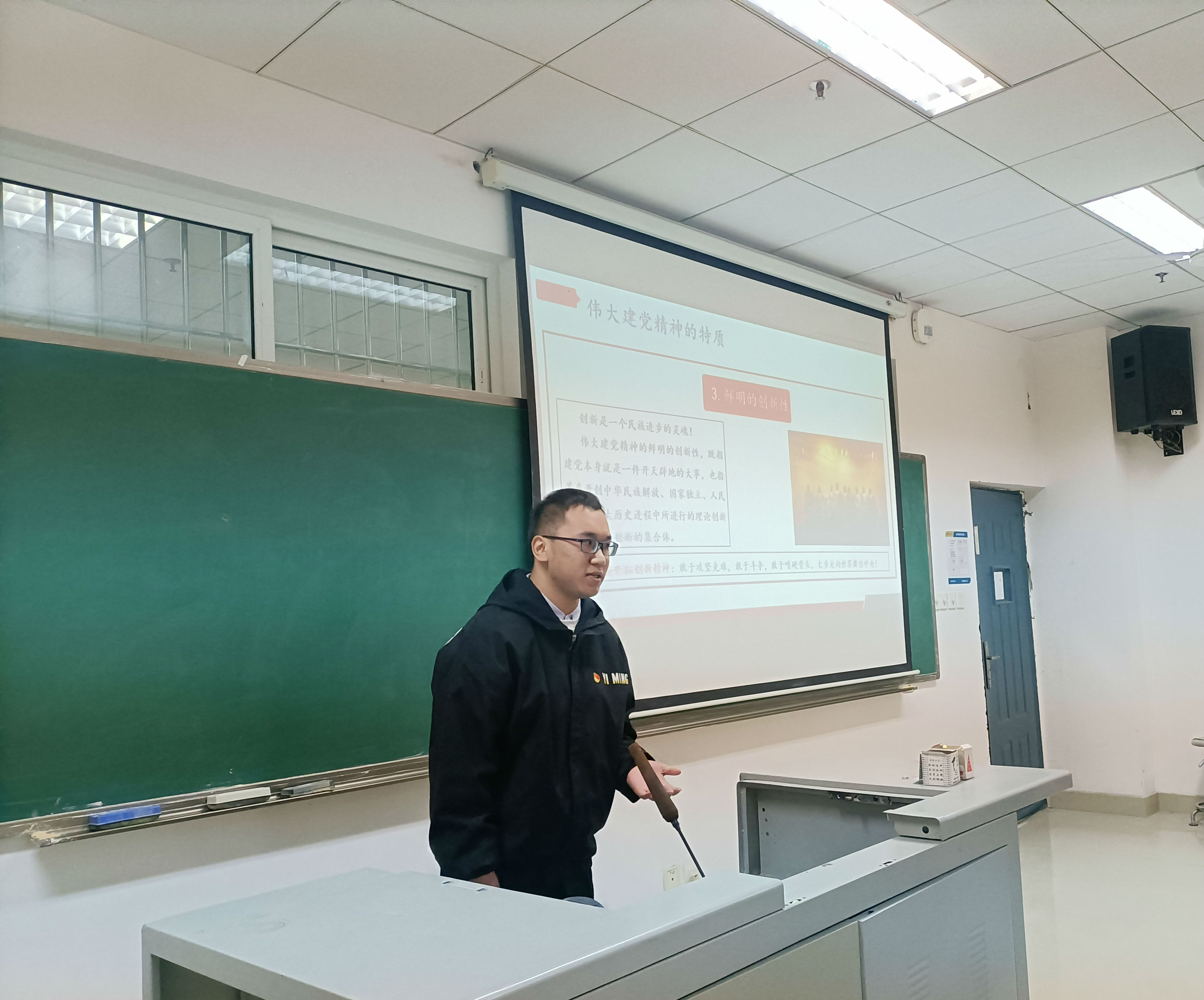 在本次宣讲中,陈凡、李鑫瑞两位宣讲员围绕习近平总书记在庆祝中国共产党成立100周年大会上的重要讲话中对伟大“建党精神”内容所作出的概括,对伟大“建党精神”的特质进行了详细讲解。陈凡认为,伟大“建党精神”集中体现了党的初心使命、理想信念、根本宗旨和优良作风,具有鲜明的人民性、鲜明的科学性和鲜明的创新性,并对其进行了深入探究。陈凡讲到,伟大建党精神是为中国人民谋幸福的初心和为中华民族谋复兴的使命的具体体现,对毛泽东思想、邓小平理论、“三个代表”重要思想、科学发展观以及习近平新时代中国特色社会主义思想这些科学性的具体体现进行了阐述,指出了实践创新,也直观反映了创新是一个政党和一个民族发展的不竭动力。李鑫瑞认为,牢牢把握伟大“建党精神”的鲜明特质,有助于深刻理解伟大“建党精神”的丰富内涵,有助于深刻理解我们过去为什么能够成功,有助于明晰未来怎样才能继续成功,能够为实现中华民族伟大复兴提供有力精神支撑。在最后,两位宣讲员将“建党精神”和“红船精神”进行比较,让同学们对认识和把握二者的关系有了更多的启发和更深的思考。同学们认真聆听,深入思考,宣讲现场氛围轻松活跃。