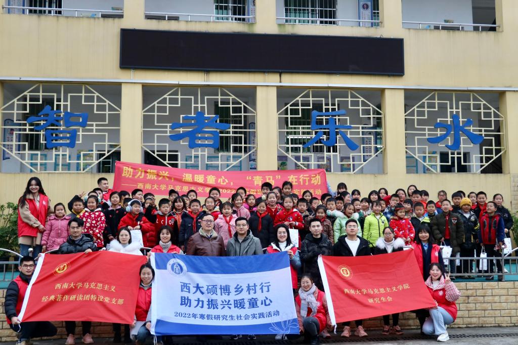 为深入学习贯彻习近平新时代中国特色社会主义思想和党的十九大精神、“七一”讲话精神和十九届六中全会精神,给广大乡村儿童带去更多的关爱和帮助,让他们深刻体验学业有教、生活有帮、困难有助、安全有保的学校与社会关爱,激励他们锐意进取、拼搏向上,培养他们热爱学习、热爱生活、热爱社会的意识,引导研究生在助力乡村振兴战略的亲身实践中树立家国情怀,提升研究生实践育人水平和质量,激励研究生践行新时代青年使命。根据西南大学研究生工作部《关于开展2022年研究生寒假社会实践活动的通知》,结合我院专业特色和优势,学院积极组织开展了“助力振兴,温暖童心,‘青马’在行动”2022年研究生寒假社会实践活动。