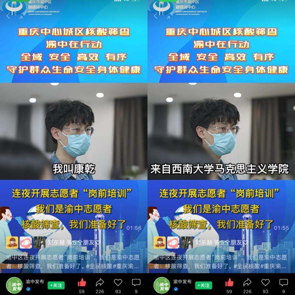 向桂英同学说道:“通过此次志愿服务活动,我也亲自体验到了40多度高温加上防护服的别样汗蒸方式,感受到了每一位医务工作者和志愿者的艰辛。但是我会为超市老板送的一箱箱水,水果店姐姐送的西瓜以及那一句句‘辛苦了!’而感到满足。同时,我也希望能够有更多的爱心人士投入到志愿服务中来,收获‘无价的回报’。我相信重庆人民众志成城,一定能战胜疫情、旱情、火情!”。同时,康乾同学以西南大学365英国上市集团学生的身份接受了渝中区融媒体中心采访,拍摄抗疫纪录片并发布到抖音、微信等平台的官方媒体帐号上。两位同学用热情和奉献,在疫情大考中彰显青春担当,展现了马院学子的优秀品质,用耐心与毅力,展现了学生志愿者的初心使命。