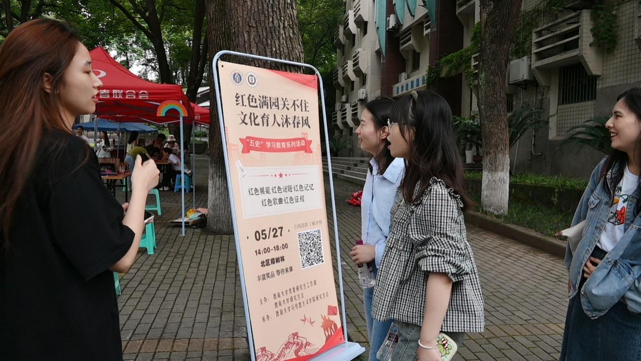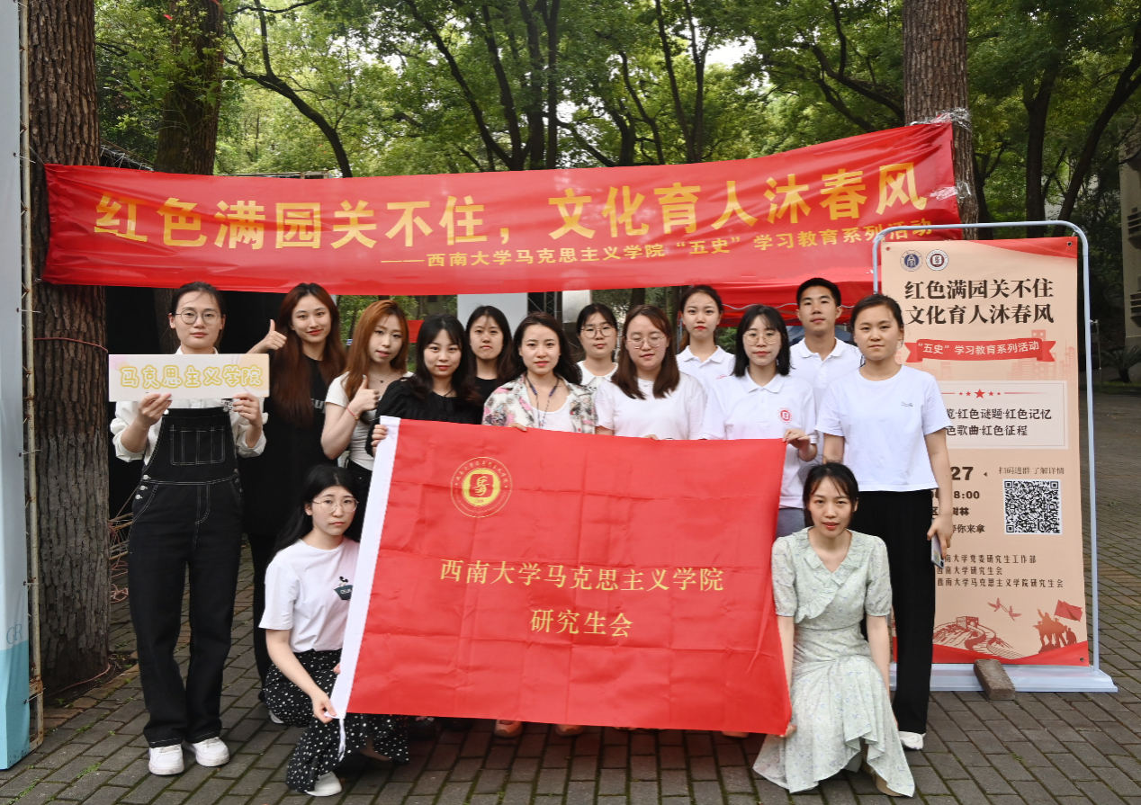 为深入推进学习贯彻习近平新时代中国特色社会主义思想主题教育,加强“五史”学习教育,充分发挥红色文化建设在培育和践行社会主义核心价值观中的重要作用,引领新时代青年学史明理、学史增信、学史崇德、学史力行,5月27日下午,西南大学365英国上市集团研究生会在北区樟树林开展“红色满园关不住,文化育人沐春风”“五史”学习教育系列活动。
