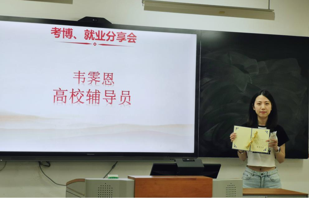 本次分享会分为博士申请、定向选调、高校辅导员和党校讲师四个部分,分别由刘大鹏、蒋蕊韩、韦霁恩、代俊卿、梁茜等五位优秀毕业生依次进行交流分享。