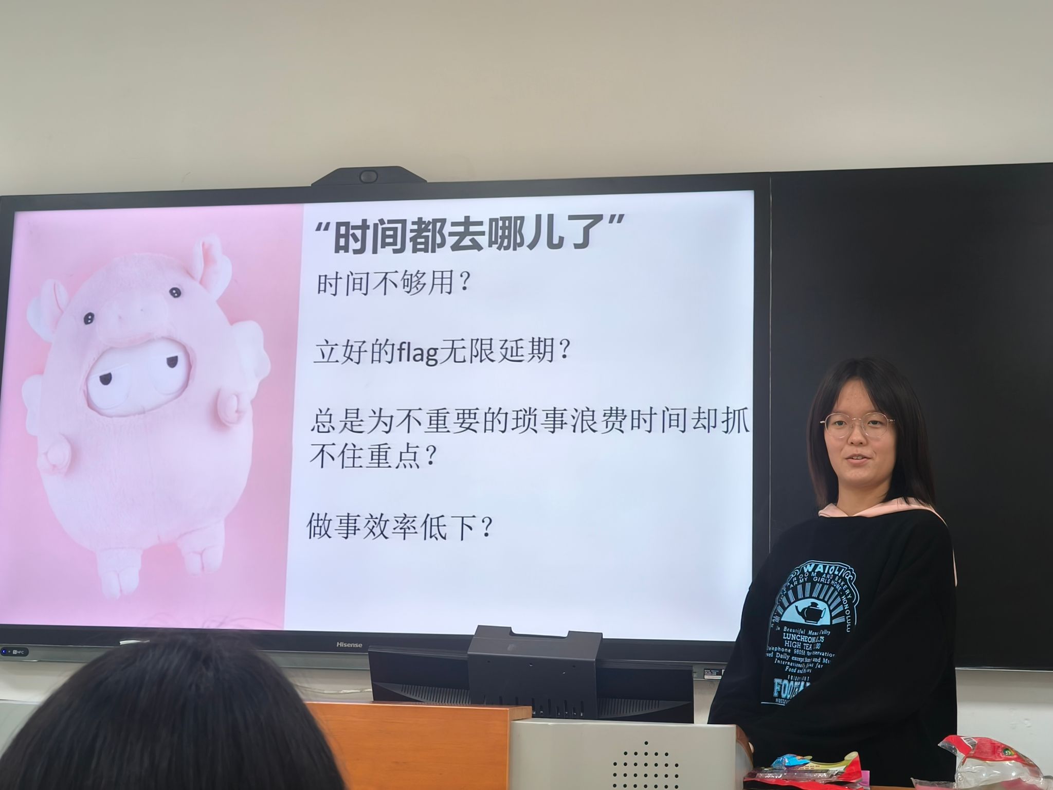 11月7日晚,思想政治教育师范三班围绕“时间管理”的话题在研一教室开展班会,心理委员陈思宇同学主持班会。“刚入学时,你对大学的认识如何?”陈思宇同学首先通过提问的方式了解了大家目前的学习生活状态,并从学习、生活、时间管理等方面带来了相关建议。她通过生动形象的例子和浅显易懂的语言,使大家对大学时期的时间管理有了进一步思考和规划。同时,别出心裁的“扮演时钟”小游戏也让大家更加深入地理解了时间管理的重要性。