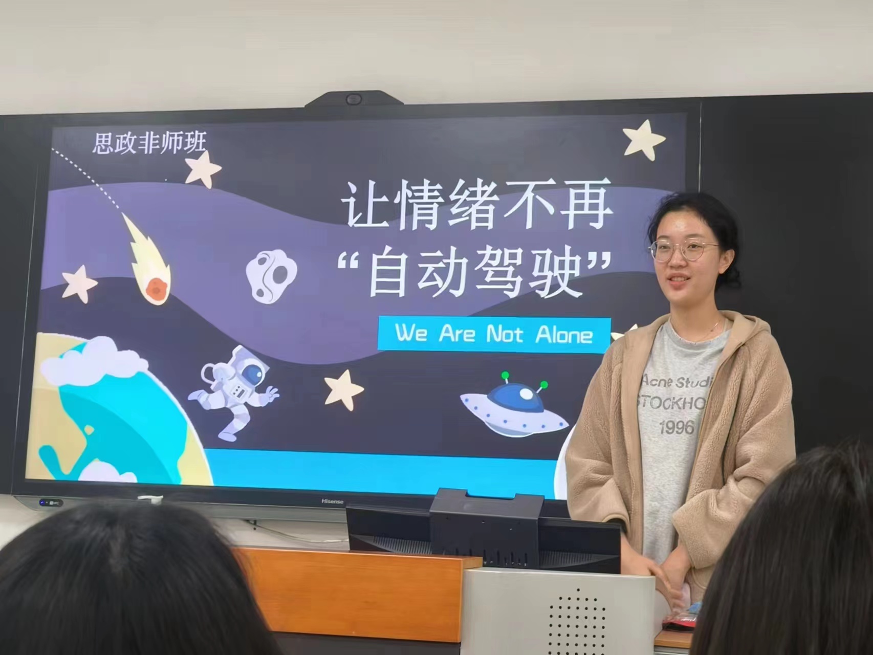 10月31日晚,思想政治教育非师班在研一教室开展了主题为“让情绪不再‘自动驾驶’”的主题班会。心理与生活委员史欣倩主持班会。本次班会从“我崩溃了”、“我接受了”、“我又行了”事件发展的三个心理活动阶段展开,向同学们介绍了负面情绪产生的原因及应对策略。接下来,学习委员李香颖从自身经历出发,总结了时间规划的小妙招,分享了缓解焦虑情绪的有效方法。