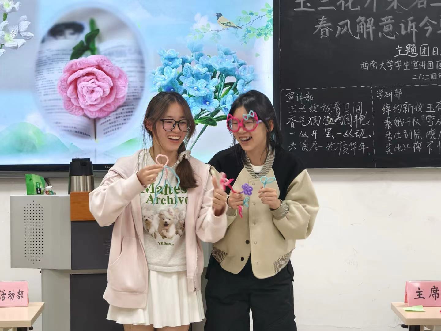 芳菲盛宴终有散,花语无言却有情。环节负责人黄雨沙引导团员朋友们充分发挥想象力与创造力,扭出朵朵精美的花束。制作完成后,各部门派出代表向在座的各位团员朋友讲述花束间的美好寓意,让我们感受到了所有团员朋友传递出来的温暖与柔情。