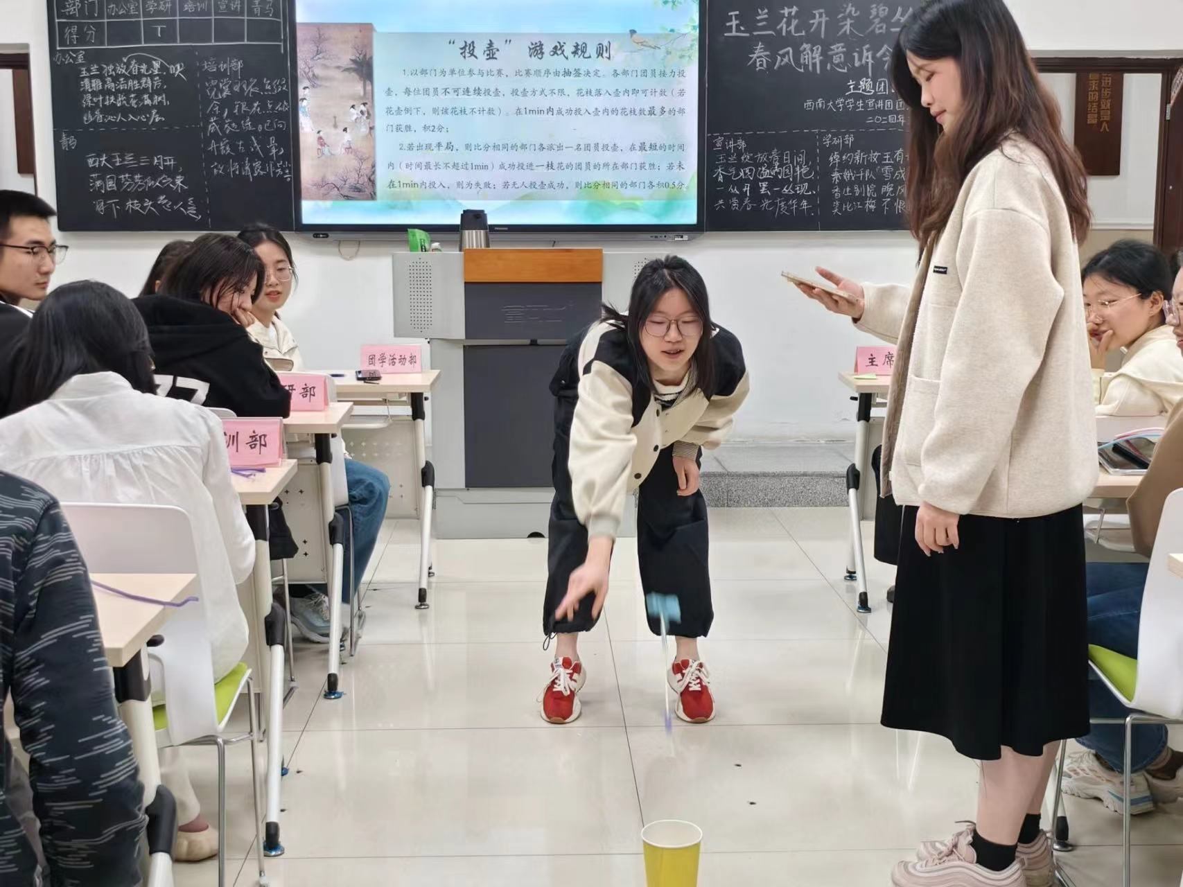 花开闲暇宾月集,衔花投壶戏雅同。在春日花朝时节,环节负责人施昱菲带领团员朋友们前往“存菊堂”,一同衔花投壶。虽然投壶距离看着很近,但难度却不小,仅有几位团员能够投壶成功。经过紧张刺激的部门角逐后,最后的赢家锁定在了学研部和办公室之间,而当学研部的伍琛妤同学创造了一秒投壶的佳绩时,全场响起了热烈的欢呼和掌声。在此次投壶游戏当中,团员朋友们不仅体验了古人的游艺之乐,更是加深了对春日中华传统竞技活动的了解。