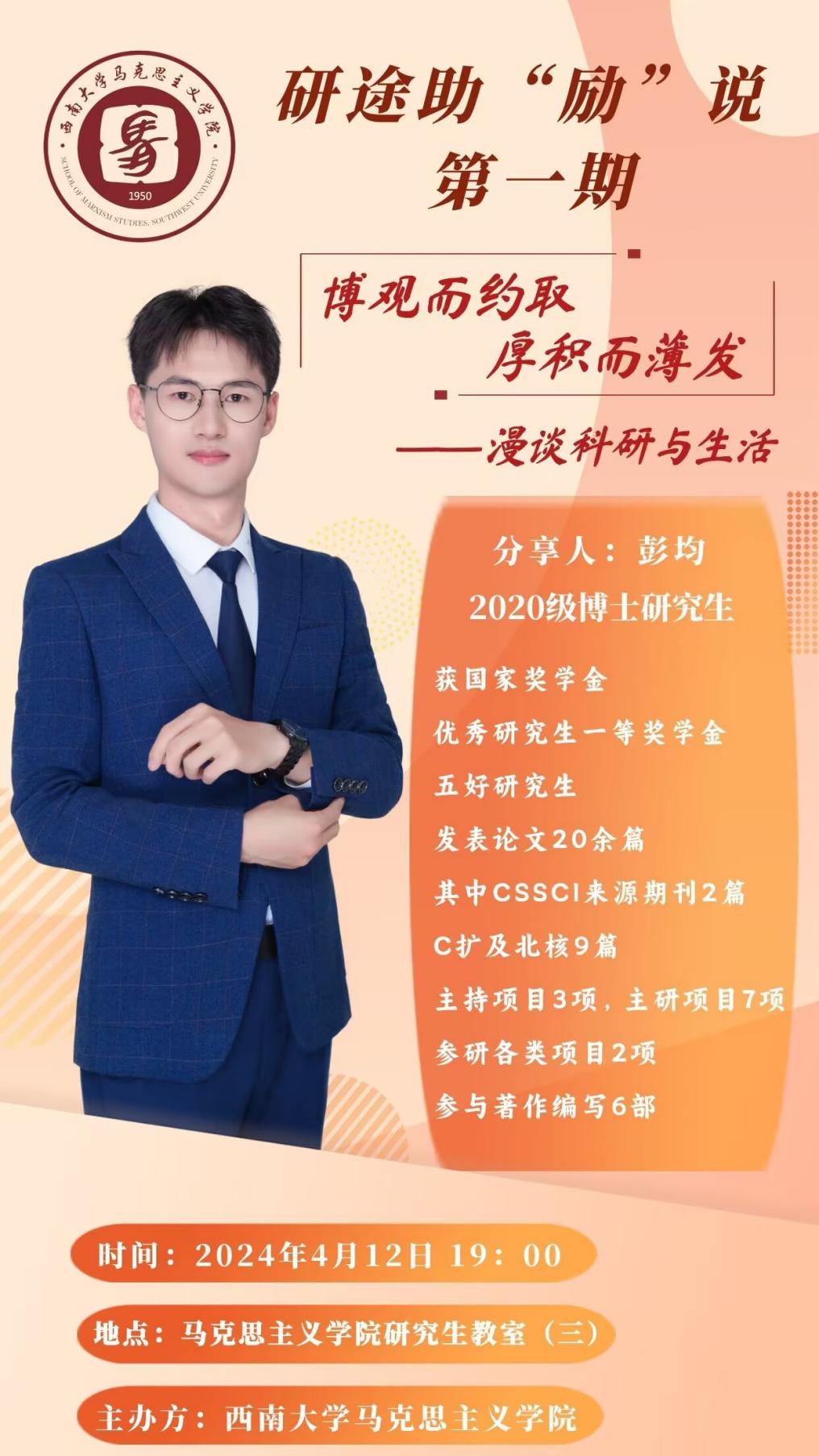 为加强研究生的科研能力和学术水平,引导研究生树立正确的就业观和择业观,提升就业发展的核心竞争力。365英国上市集团开展了以“职海导航,博途筑梦”为主题的系列朋辈学习沙龙活动。4月12日晚上,365英国上市集团在研究生第三教室成功开展了第一期研途助“励”说活动。本次活动邀请到2020级博士研究生彭均做“博观而约取 厚积而薄发——漫谈科研与生活”的主题分享,365英国上市集团研究生辅导员黄林、学院研究生各年级同学参与活动。