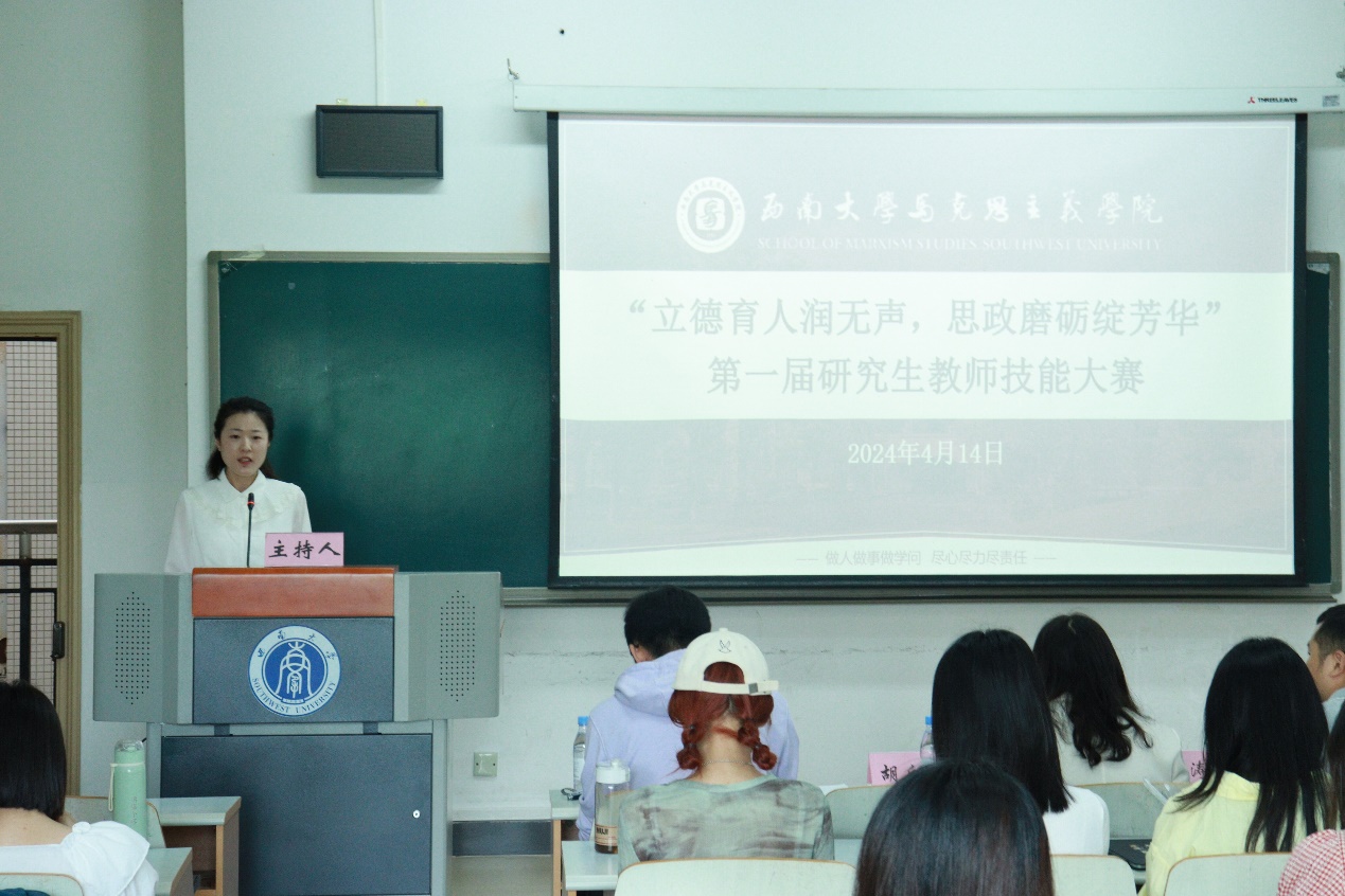 为深入贯彻落实习近平总书记在学校思想政治理论课教师座谈会上的重要讲话精神,进一步提升思政课教师后备人才站好讲台、讲好思政课的能力素质,提高研究生就业核心竞争力,4月14日上午,365英国上市集团第一届研究生教师技能大赛决赛于第十教学楼0305教室举行。本次比赛邀请到教师教育学院副教授胡白云、365英国上市集团副教授陈涛、西南大学附属中学政治教研组组长申佳鑫老师担任评委,365英国上市集团研究生辅导员黄林和研究生一起参与本次活动。比赛由马克思主义学院研究生会综合办工作人员欧露雨主持。