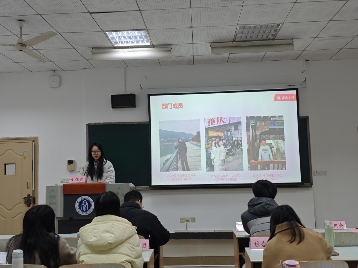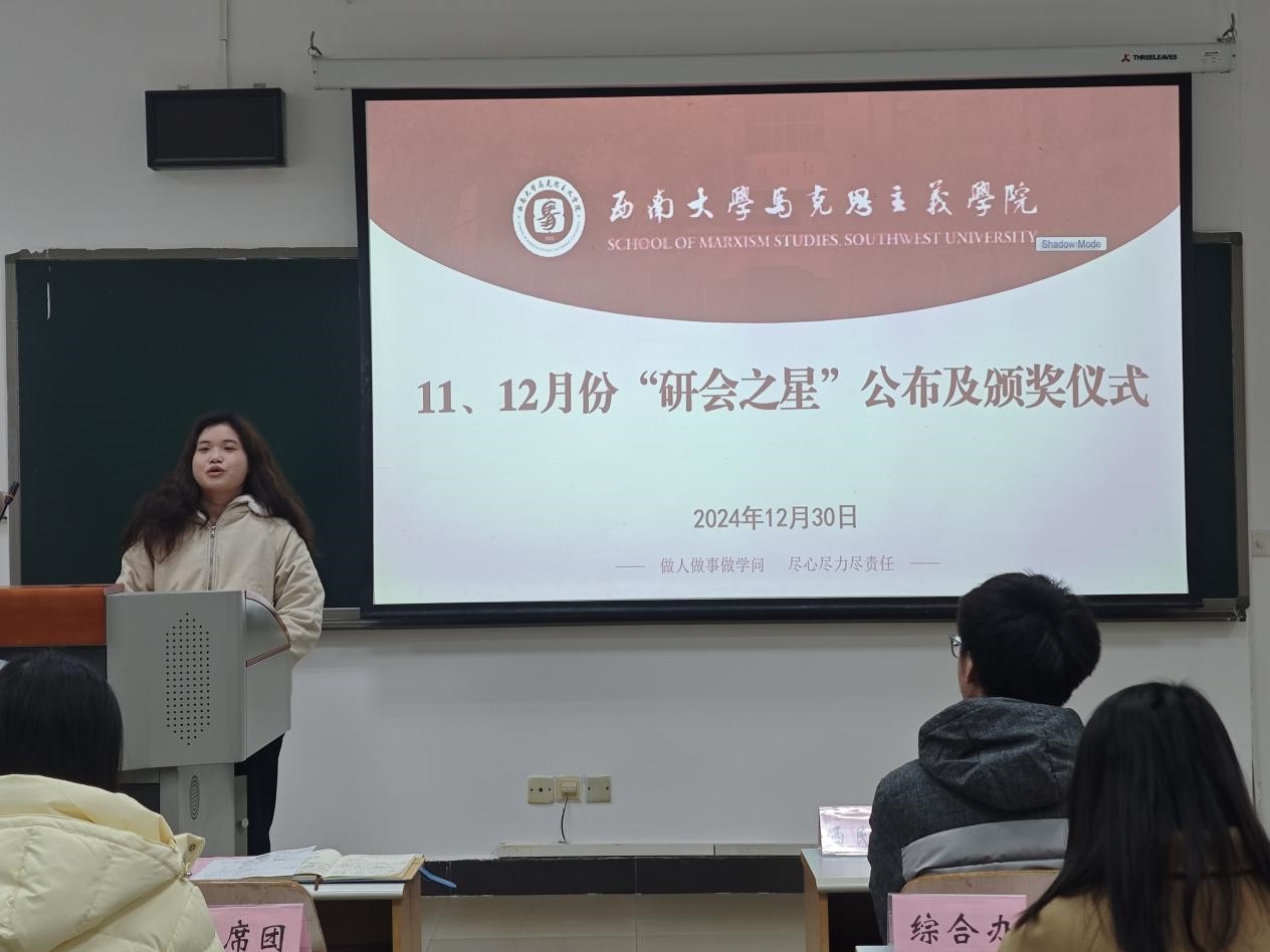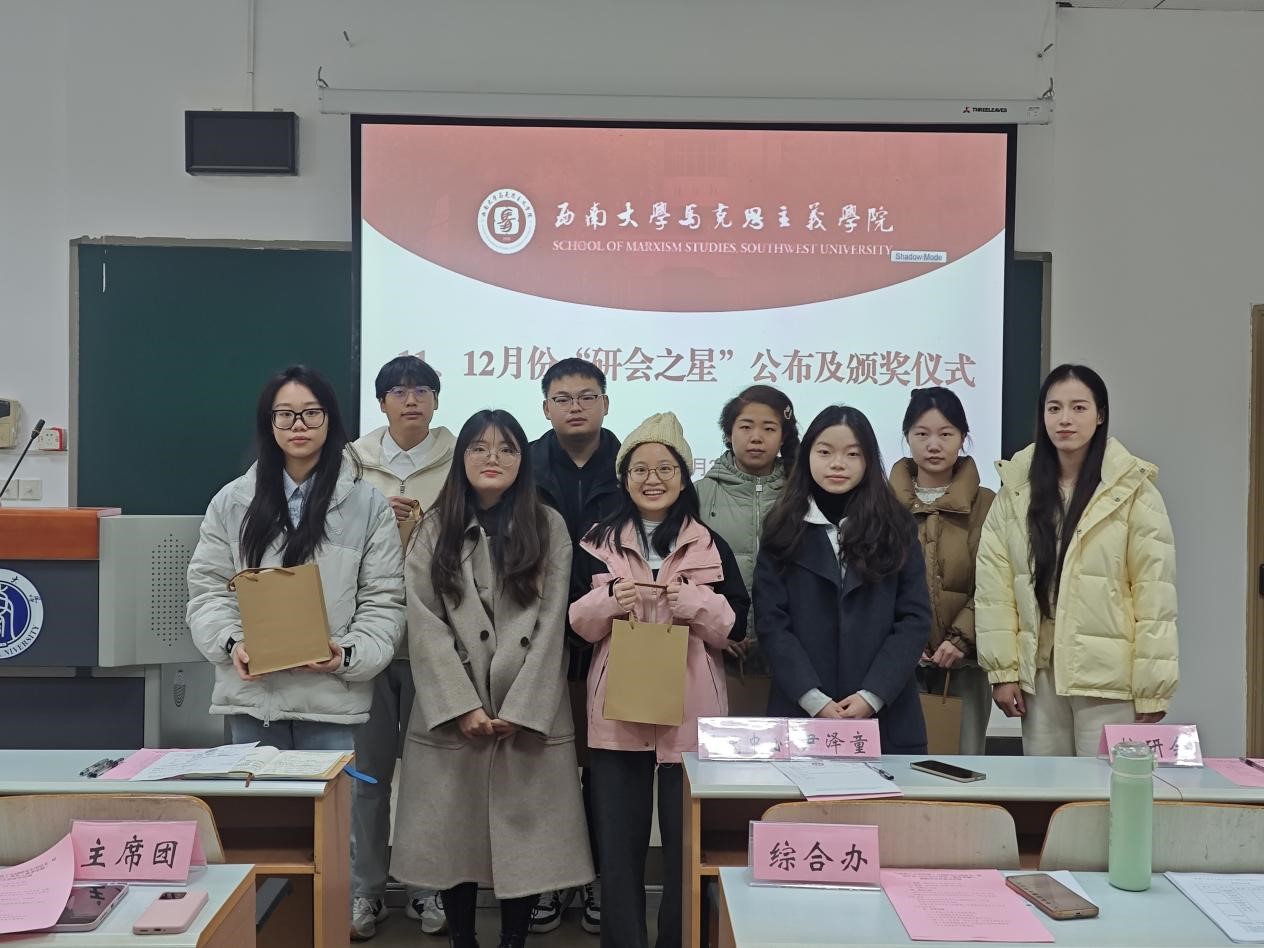 在表彰环节,宣传部工作人员刘霞和学研部工作人员田琪分别被评选为十一月份、十二月份的“研会之星”。此外,会议还对在工作中表现优异的余正权、敬帅、陈琳、刘杰、曲响、蒋欣秀六名成员颁发了奖品。