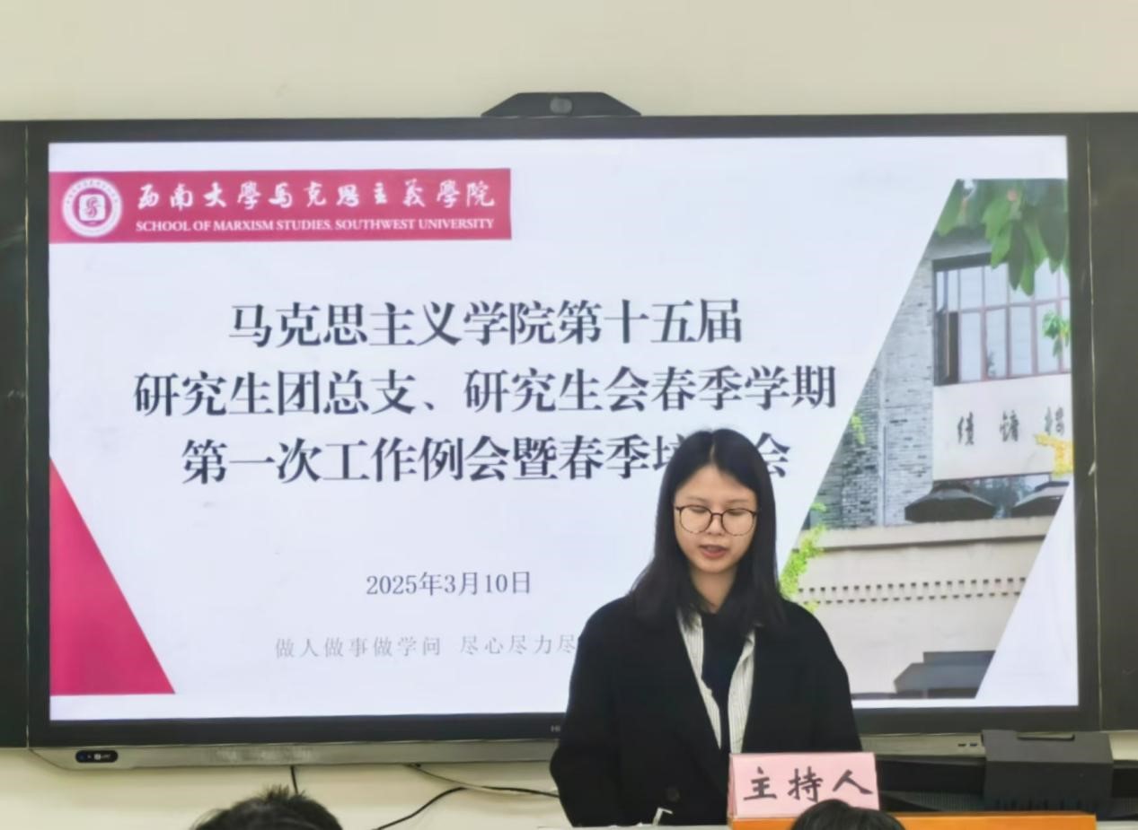 各部门负责人依次总结了上学期工作,结合学院特色与学生需求,精心策划新学期各项活动,并汇报三月份工作规划,为研究生会后续工作的有序开展奠定了坚实基础。主席团成员蒋俊滟对研究生会三月份整体工作规划进行了汇报。她强调,一是对标对表,扎实开展常规工作;二是不断探索,开拓研途系列活动;三是代代传承,助力研会发展新征程。