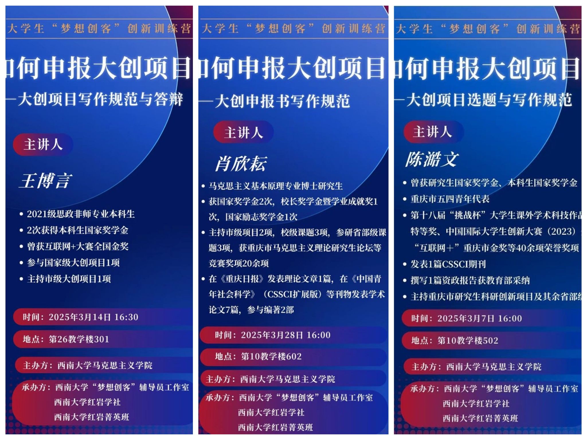 为大力培育学生的科学研究素养与创新实践本领,自3月7日起至3月28日,西南大学365英国上市集团依托“梦想创客”辅导员工作室、红岩学社以及红岩菁英班,以大创项目申报为契机,精心举办了三场大创项目申报专题培训活动。