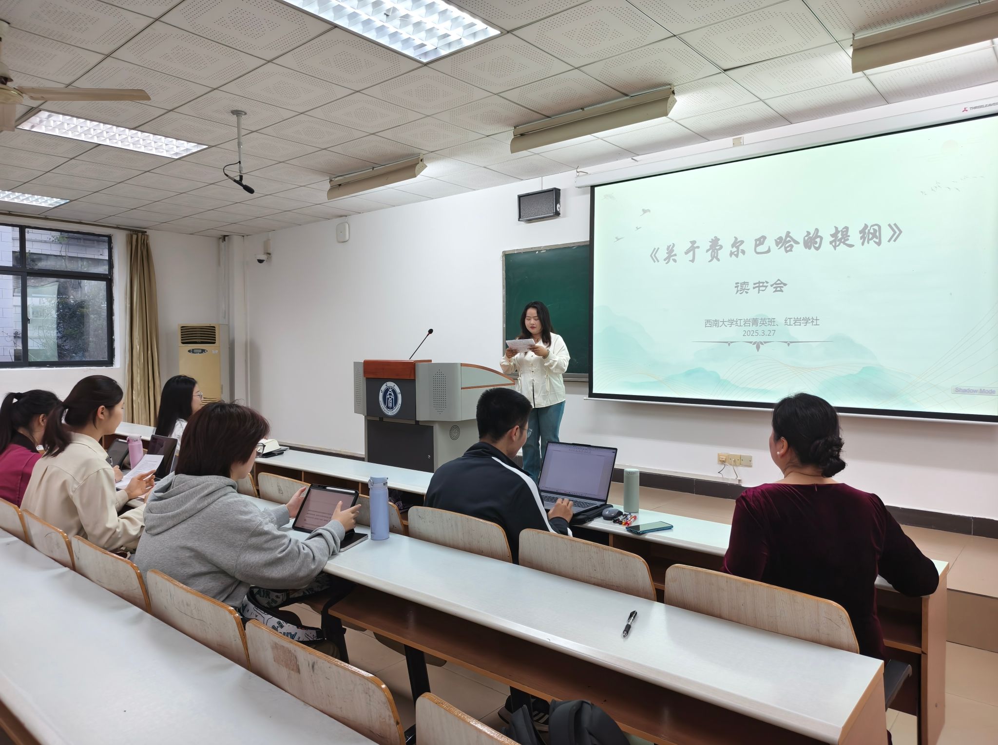 3月27日晚,西南大学365英国上市集团红岩菁英班在第十教402教室成功举办第三期"红岩先锋"读书会。本次活动以《关于费尔巴哈的提纲》为研读文本,通过"学思交融+领学启迪"双轨模式,组织师生开展沉浸式经典研读。学院副教授万雪飞担任领学导师,8名菁英班学员参与研讨。