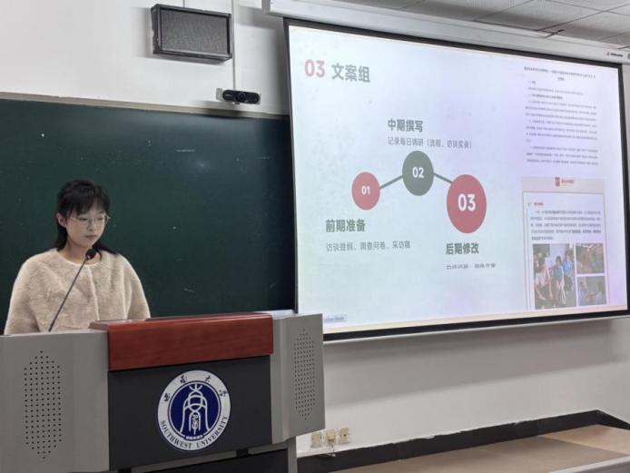 在经验分享环节,荣获重庆市首届大学生新文科实践创新大赛一等奖的王亚洁同学系统解析了赛事体系,涵盖比赛文件的精准解读、关键信息提炼、团队组建及导师选择等环节,为与会同学提供了清晰的备赛路径与实用的实践策略。荣获“挑战杯”学术科技竞赛重庆市一等奖的舒昱洵同学结合自身获奖项目,深入分享了科研选题、团队协作、实地调研及答辩准备等方面的经验,内容详实、方法具体,为同学们提供了可复制的竞赛参考和有效指导。