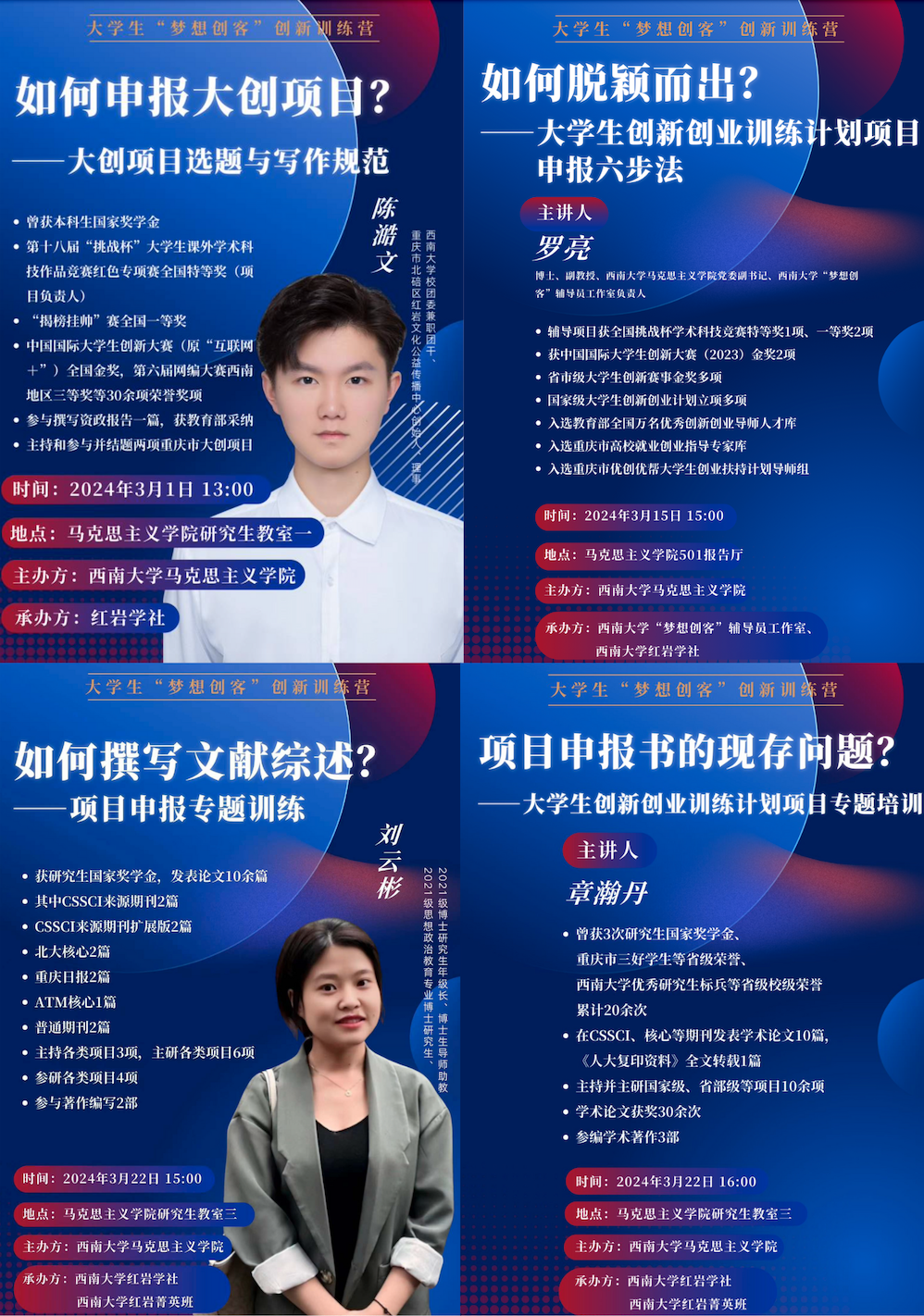 本次专题培训分主题、阶段化地伴随西南大学2024年大学生创新创业训练计划项目申报展开,从大创项目选题与写作规范,到大学生创新创业训练计划项目申报六步法,再到文献综述三步法,最后点明学生初版申报书现存的共性和个性问题并进行解答与指导,层层深入、条分缕析。