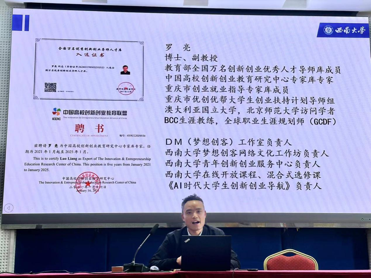理清项目思路是项目申报的关键。学院党委副书记、西南大学“梦想创客”辅导员工作室负责人罗亮老师讲解了大学生创新创业申报六步法。一是详细讲述了参赛全流程,从赛道选择和选题设计,到项目挖掘与团队匹配,再到资源整合、项目迭代优化,方方面面都做出了具体的讲授;二是针对“参赛项目创新点如何探究”这一问题,给出了“研究角度新、理论框架新、对策建议新”的建议;三是讲明答辩环节如何准备;四是针对学生问题进行答疑,解答了“选题价值”“选题优化”“当前热点方向”“申报合理化表述”及“团队合作”几个常见关键问题。