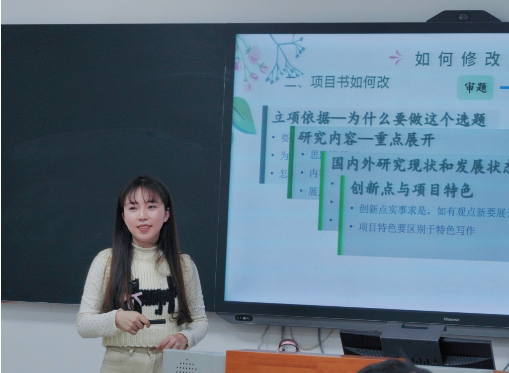 确定选题是项目开展的前提,规范写作是科研入门的基石。学校团委兼职团干、重庆市北碚区红岩文化公益传播中心创始人、理事陈澔文以问题为导向,围绕大创项目选题与写作规范传授经验。一方面科普了大创申报的基础信息,对大创申报时间线和申报书的写作特点进行了详细说明;另一方面介绍了申报书撰写的基本要求,强调了撰写的学理性与逻辑性。