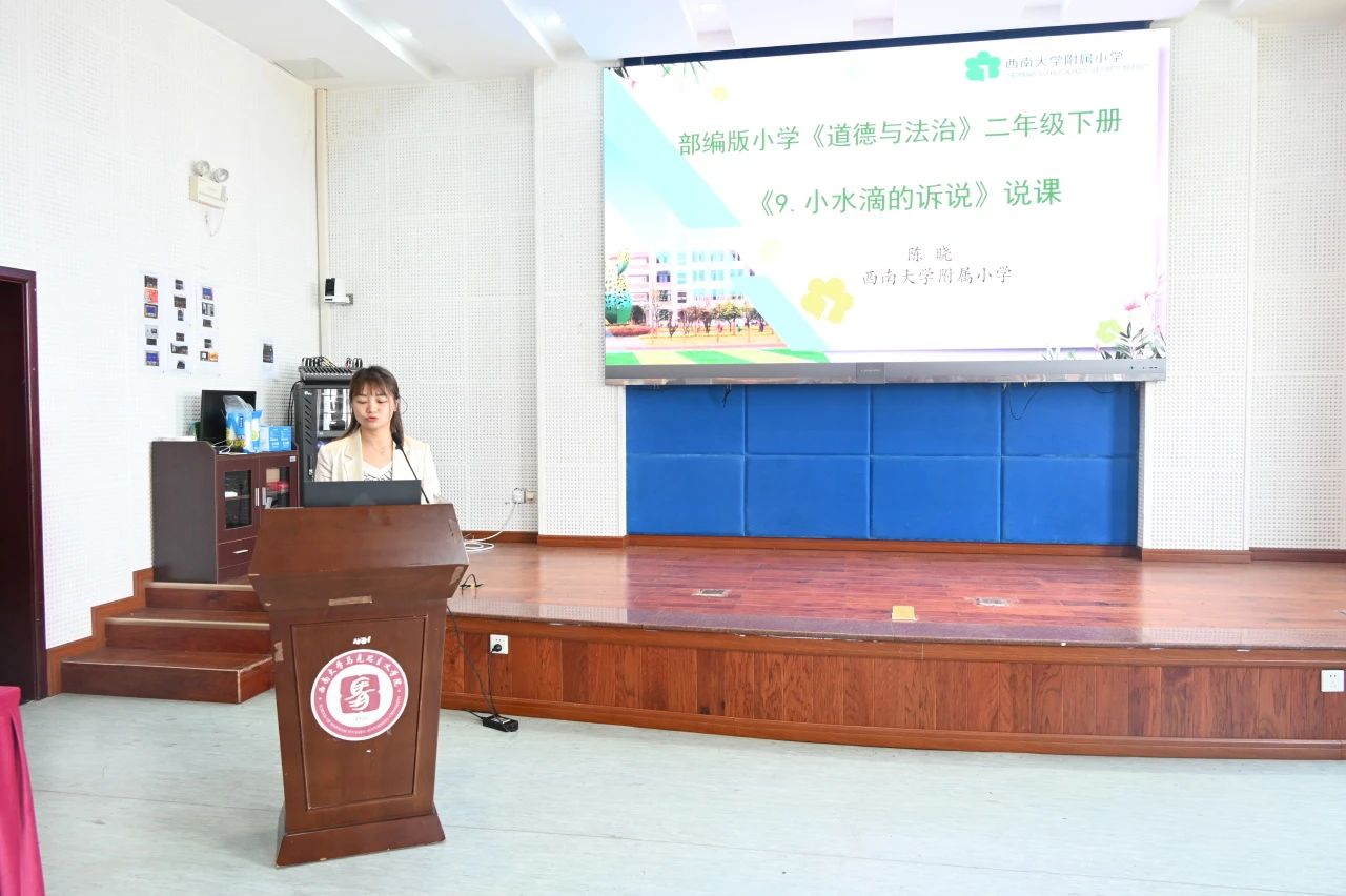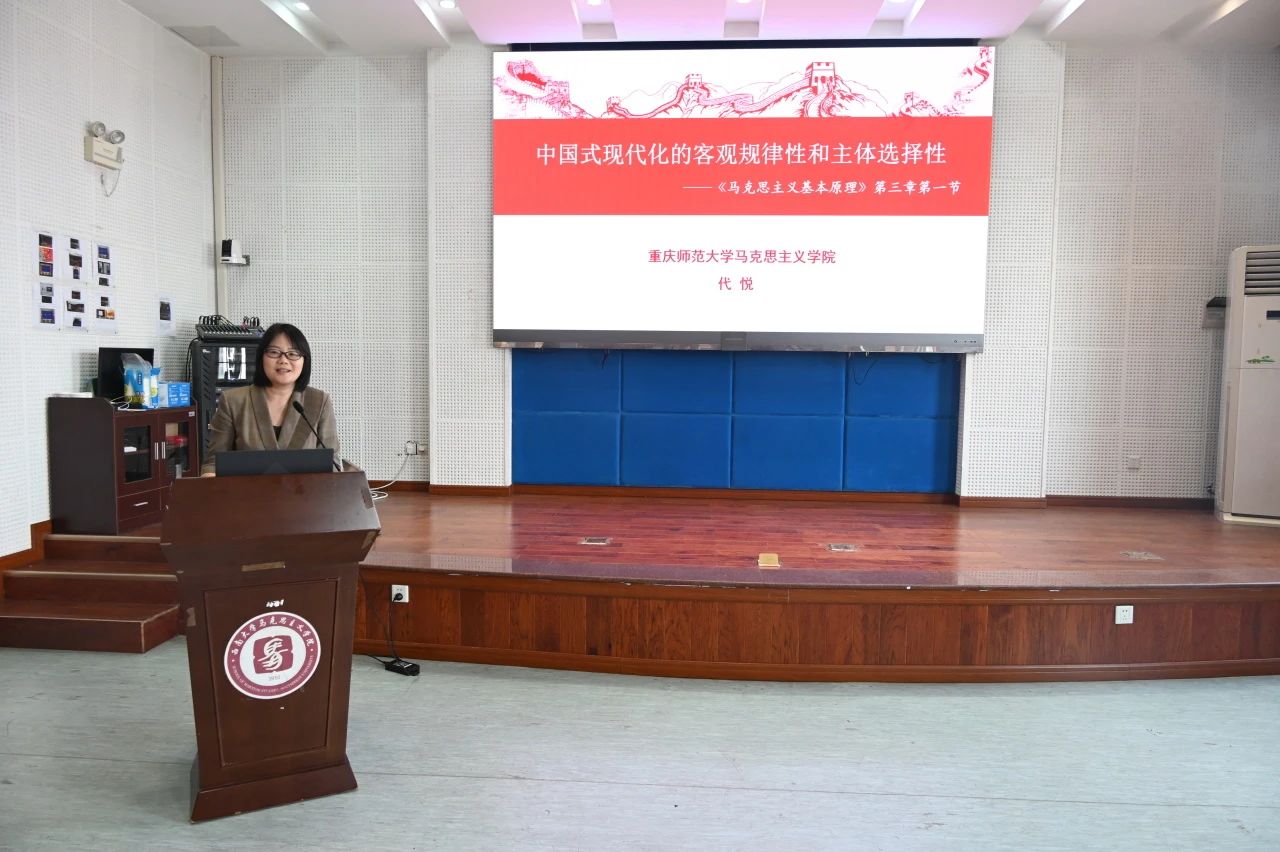 集体备课会第二环节由大中小学各学段思政课教师围绕“两会”精神一体化融入思政课教学进行了说课展示。西南大学附属小学陈晓老师以“小水滴的诉说”为题展示了绿色发展理念融入小学思政课教学的设计,重庆市南开中学陈庆老师以“家校共育、爱在家人”为题呈现了教育强国理念融入初中思政课教学的设计,重庆市第一中学欧阳以芮老师以“党建+思政”为主题展示了“坚持党的领导”融入高中思政课教学的设计,重庆立信职业教育中心周凯江老师以“实现可持续发展”为题展示了新发展理念融入中职思政课教学的设计,重庆城市管理职业学院李尚伦老师以“加快建设科技强国”为题展示了新质生产力理论融入高职思政课教学的设计,重庆师范大学代悦老师以“规律客观性与主体选择性相结合”为主题展示了中国式现代化融入高校思政课教学的设计。六位来自各学段的思政课教师,围绕今年“两会”中的关键词和习近平总书记“两会”期间重要讲话精神,结合各学段思政课教学内容,立足跨段一体化教学设计,呈现了精彩的教学设计,充分体现了一体化的教学理念。
