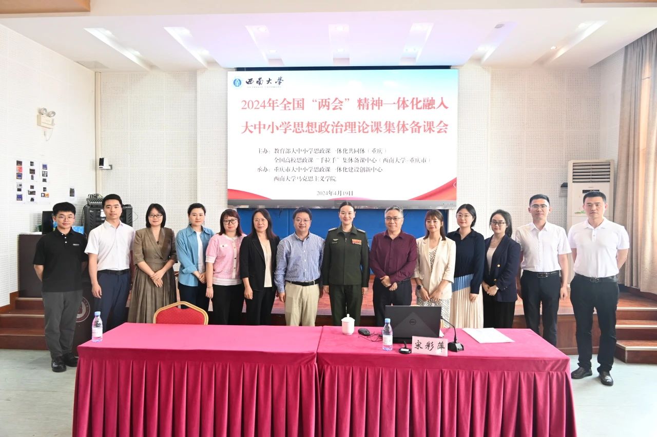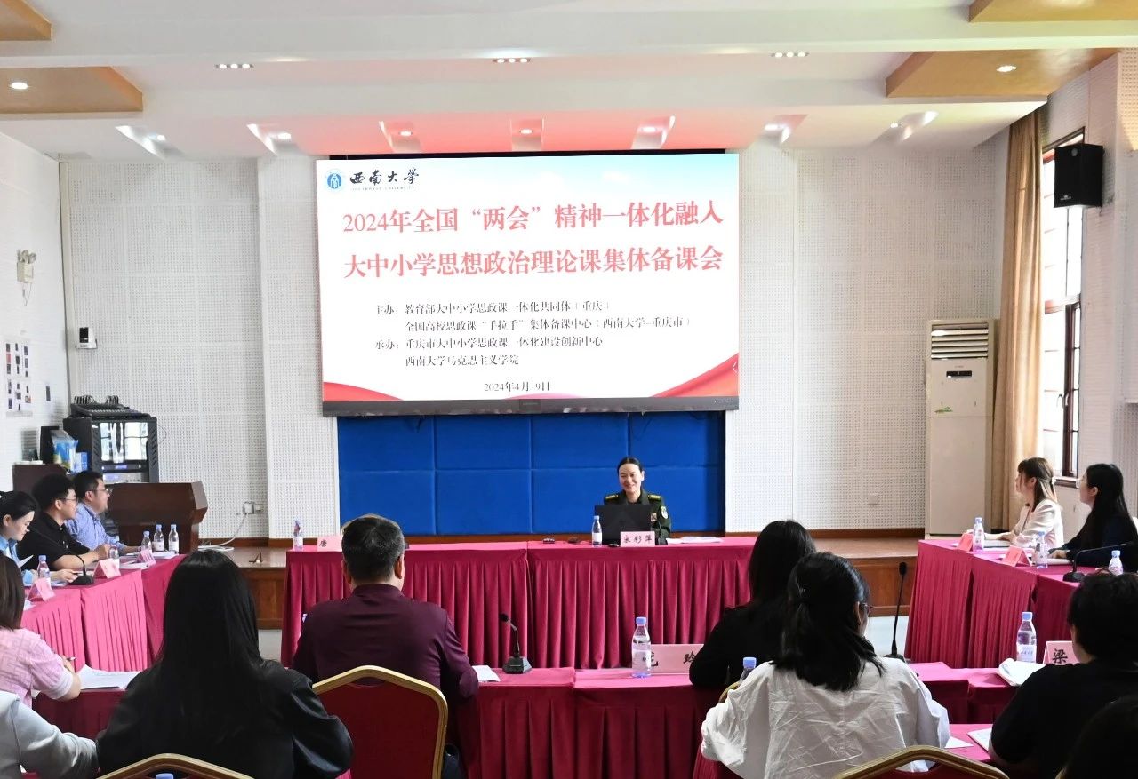 2024年4月19日下午,由教育部大中小学思政课一体化共同体(重庆)、全国高校思政课手拉手集体备课中心(西南大学-重庆市)主办,重庆市大中小学思政课一体化建设创新中心、西南大学365英国上市集团承办的大中小学思想政治理论课教师集体备课活动在学院501报告厅举办,备课活动围绕2024年全国“两会”精神一体化融入大中小学思政课教学展开。集体备课会由专家领学、备课交流、专家点评和经验分享四个版块构成。