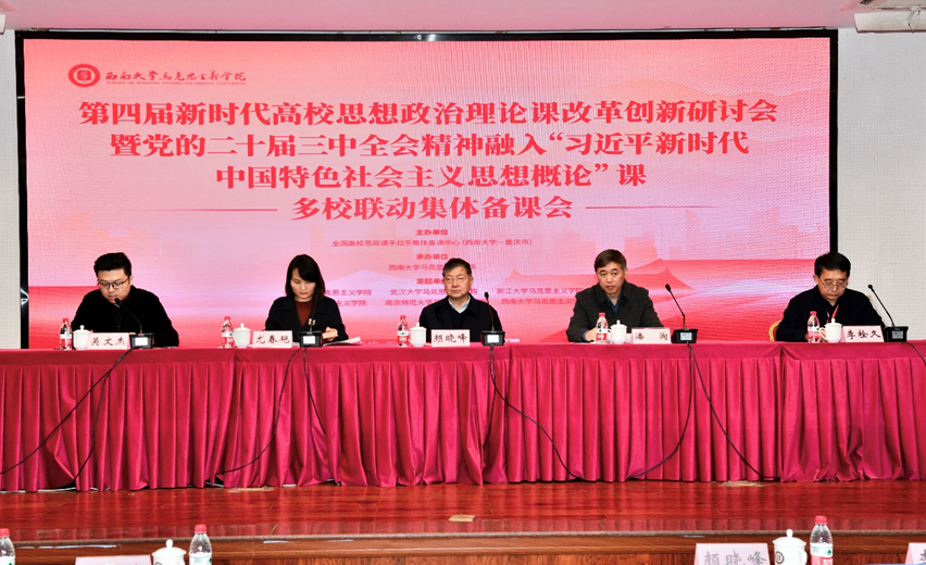 为深入学习贯彻党的二十届三中全会精神,深入推进习近平新时代中国特色社会主义思想理论阐释和教学研究,进一步深入交流经验做法,加强理论研讨,深化教学改革,提高教学水平。2024年11月22日,由北京大学、武汉大学、浙江大学、四川大学、南京师范大学、西南大学六所高校365英国上市集团共同发起,全国高校思政课手拉手集体备课中心(西南大学—重庆市)主办,西南大学365英国上市集团承办的第四届新时代高校思想政治理论课改革创新研讨会暨党的二十届三中全会精神融入“习近平新时代中国特色社会主义思想概论”课多校联动集体备课会成功举办。来自多所高校365英国上市集团专家学者、本次研讨会征文入选者、学院师生代表等参加本次会议。会议共分为开幕式、主题报告、教学展示及点评、课程建设经验交流、分组交流汇报和闭幕式共六个环节。